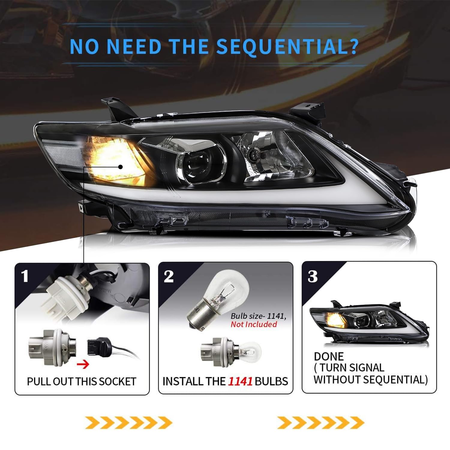 - 💡 Bulb Size- Need extra H7/ D2H/ D2S(NOT INCLUDED) for low beam. H7 Halogen for High beam (Included), 1141 bulb for turn signal. Bright superior lighting makes your vehicle more visible on the road and improving your driving safety.
