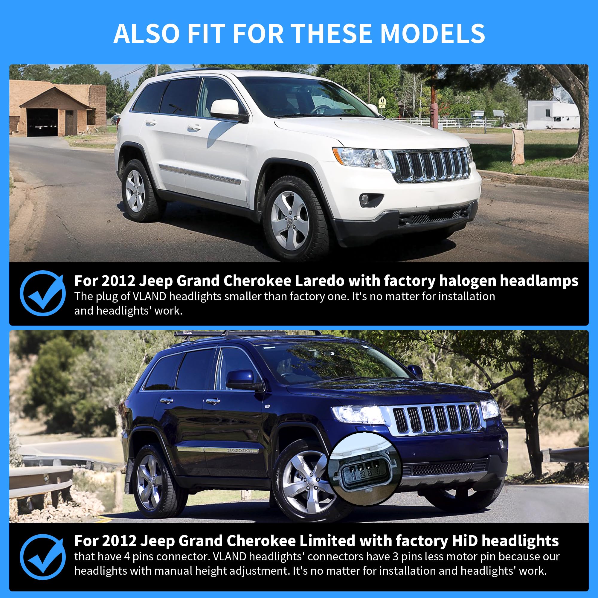 - OEM Direct Fitment - Replacement for Fourth Generation Grand Cherokee WK2 2011 2012 2013 Halogen/ Xenon Models. Factory Halogen Models need Adaptor( Included in The Package)! If not received the adaptor, please message us with the car models and pics of factory headlamps' plugs to get the adaptor if need.