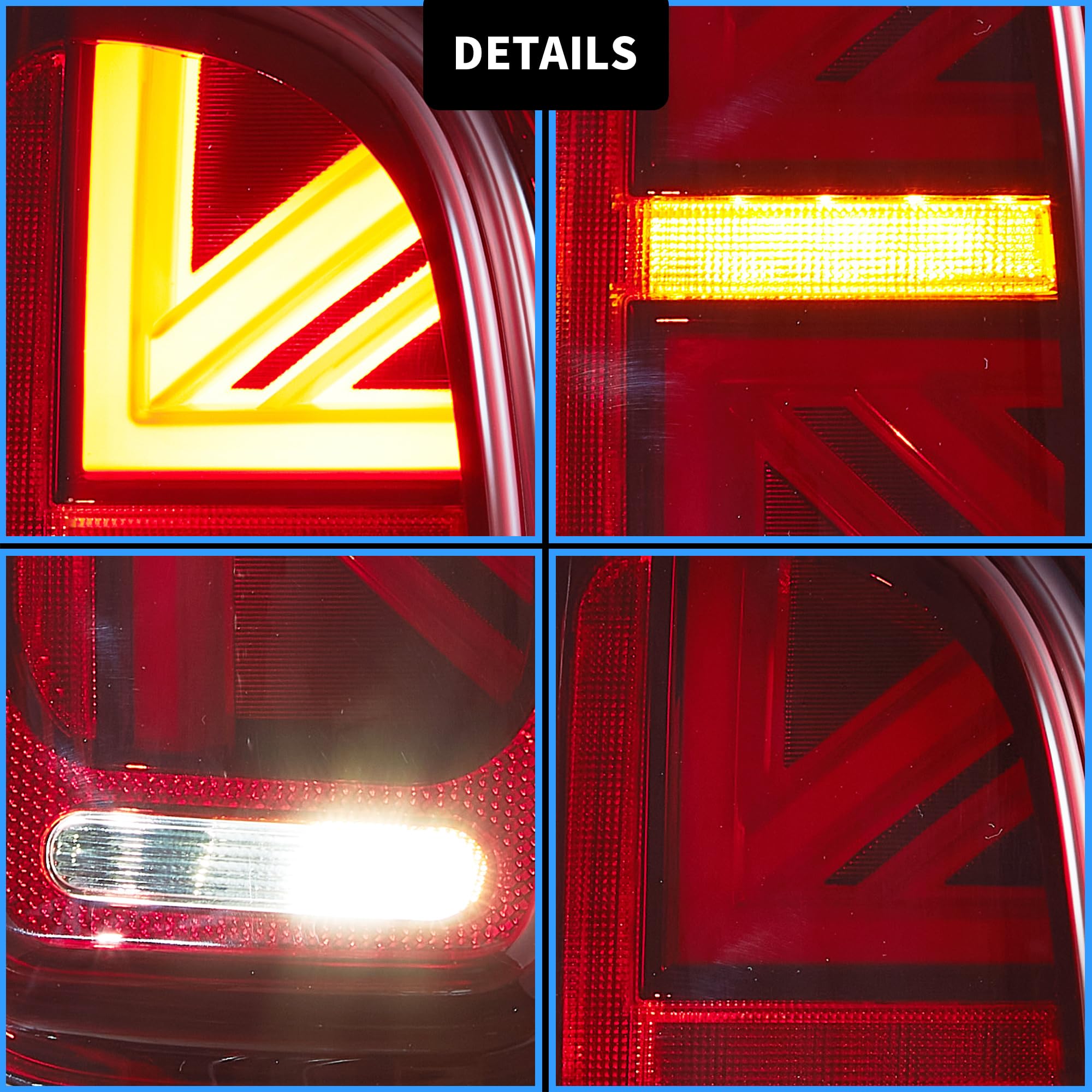 - Features - Full Led rear lamp Union Jack design+ Red brake light + Red running light+ Amber turning light+ White Reverse light + Red Fog light. Come with pairs including passenger side and driver side.