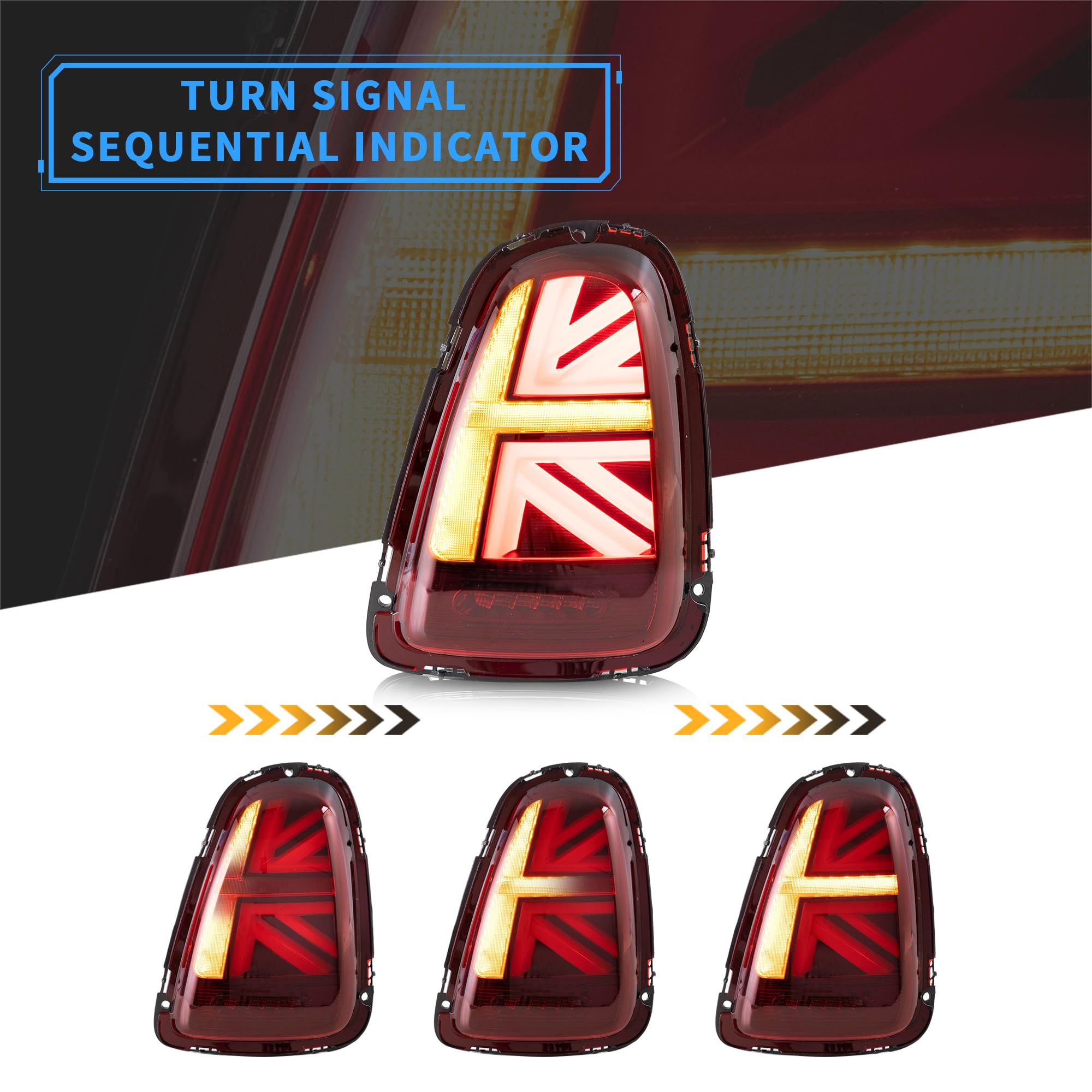 - Features - Full Led rear lamp Union Jack design+Red brake light and running light+Amber sequential turning light+Come with pairs including passenger side and driver side